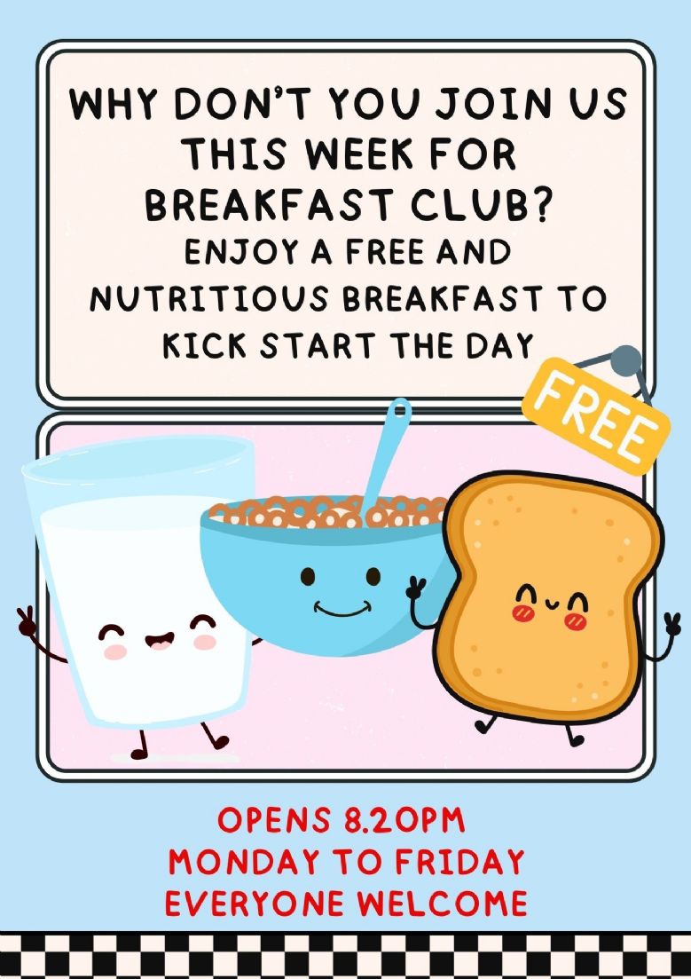 Breakfast Club starts at 8:20am and takes place in the school hall. The doors close at 8:40am prompt. It is open to all children, including Nursery - Year 6.